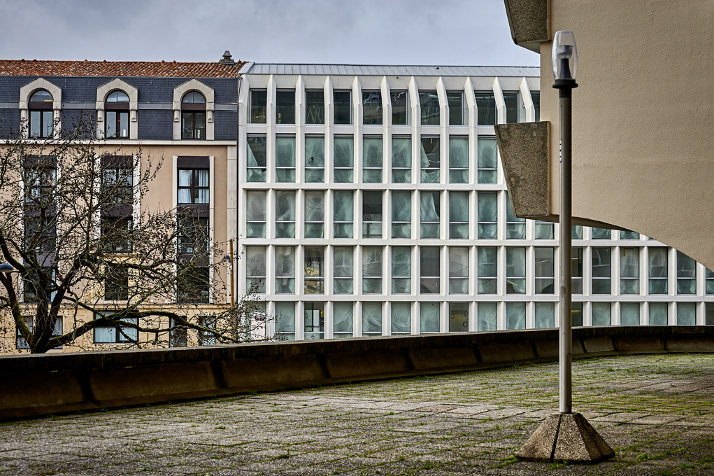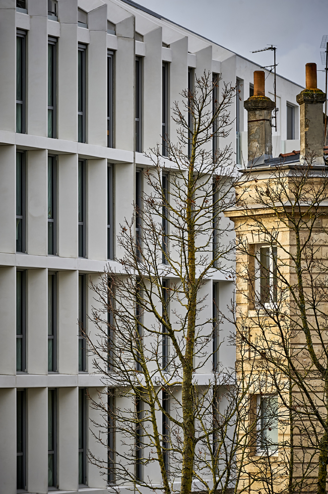 The emblematic position of the project gives a particular treatment to the envelope: an urban facade on the street side and a garden facade at the heart of the block. The project establishes a dialogue with the existing urban fabric by attaching itself to neighboring buildings and resuming their volumes. Finally, the major objective of the project is to maintain a built-up line by reconstructing the outline of a classic island and to keep the angle on the crossroads to assume itself as a signal building. Located in the “city of stone” sector and face-to-face with the resolutely contemporary Mériadeck district, the project is therefore envisaged as a harmonious transition between these two dissimilar spaces and tends to build the last missing corner of the block. , by harmonizing the facade heights of adjoining buildings, as is observed both at the city level but also in the block concerned.