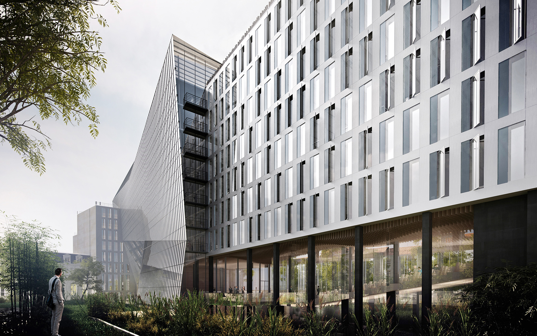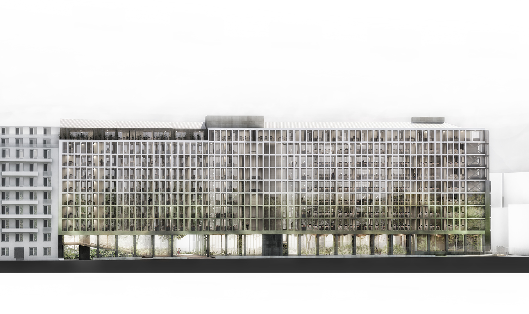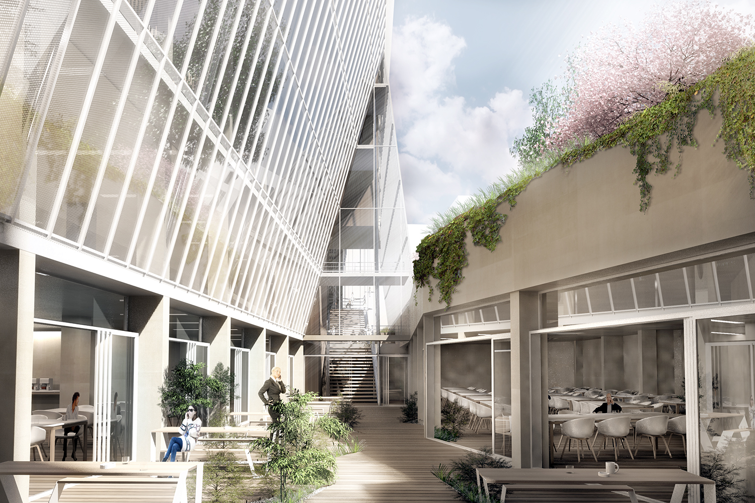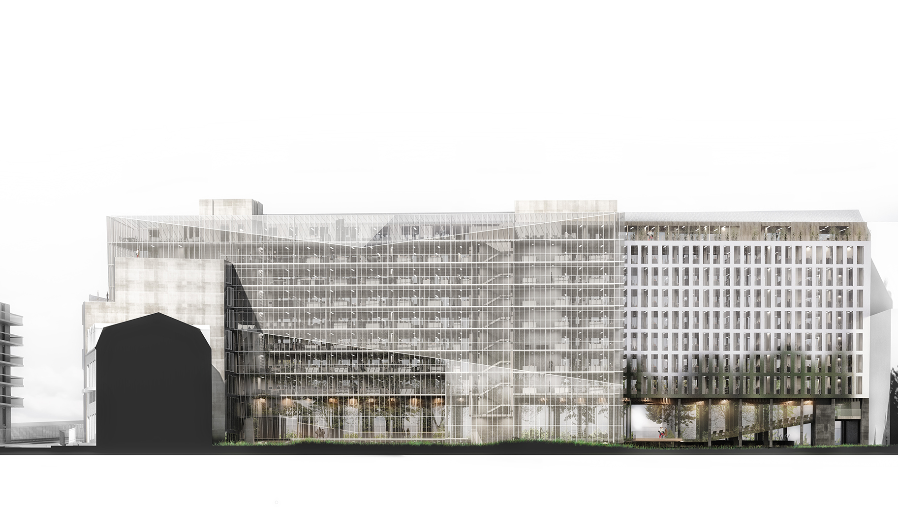 Un bâtiment existant a son histoire propre, s’attaquer à sa transformation c’est tenter de le comprendre en tant qu’organisme. C’est l’occasion de le repenser dans son ensemble comme un organisme ayant subi des altérations mais néanmoins détenteur de nombreux potentiels de mutation. Ici l’infrastructure a de réelles capacités de transformation. La réalisation du bâtiment en deux phases a généré des incohérences dans la distribution des niveaux. Le parking déborde de la superstructure et présente des hauteurs intéressantes. Le sous-sol recèle des richesses spatiales utilisables autrement que pour du stationnement. C’est pourquoi l’extension vient littéralement ouvrir le sol, et se plier pour fabriquer un patio dans son emprise, au niveau du premier sous-sol ainsi rendu à la lumière naturelle et aux usages collectifs.