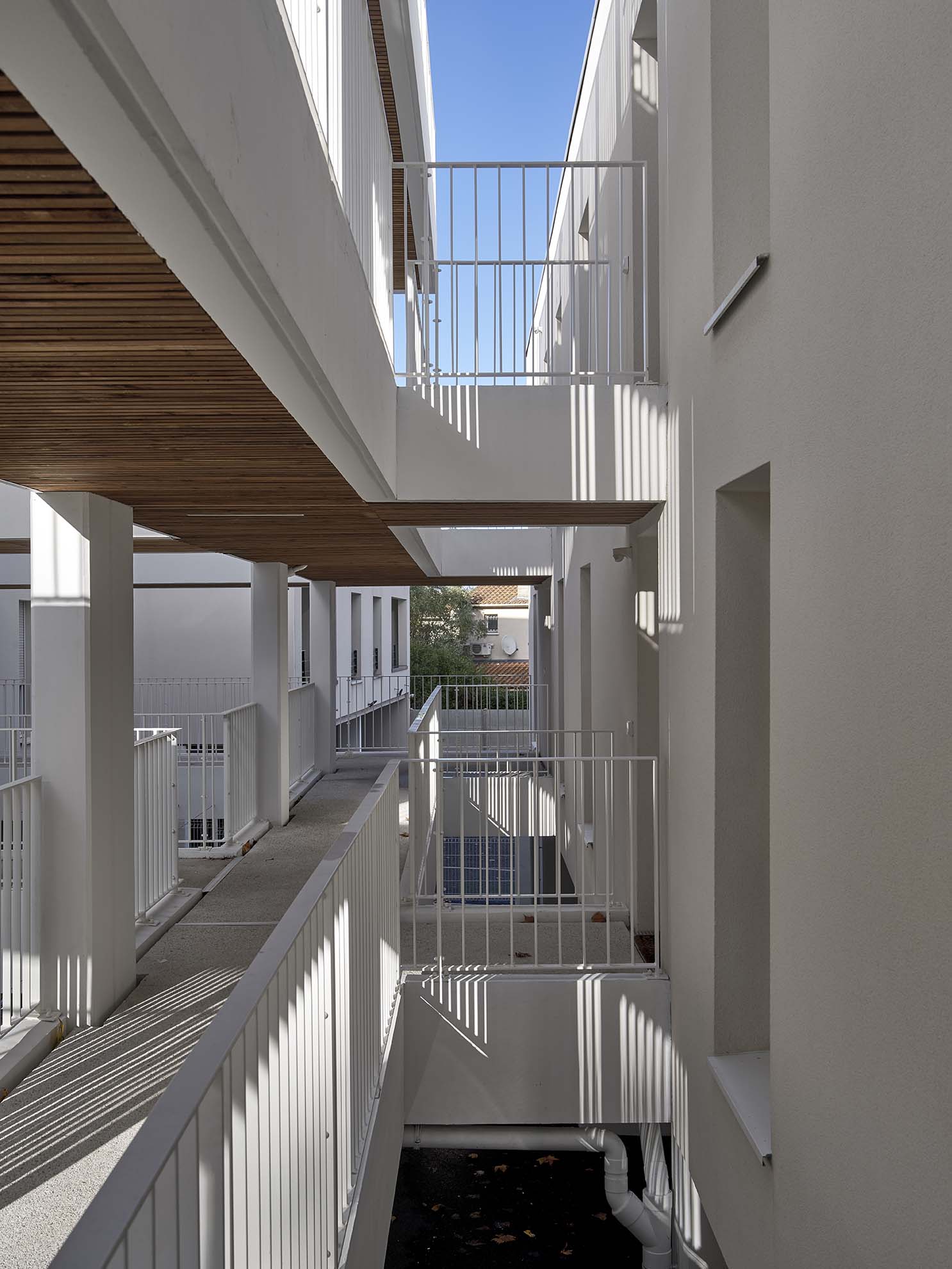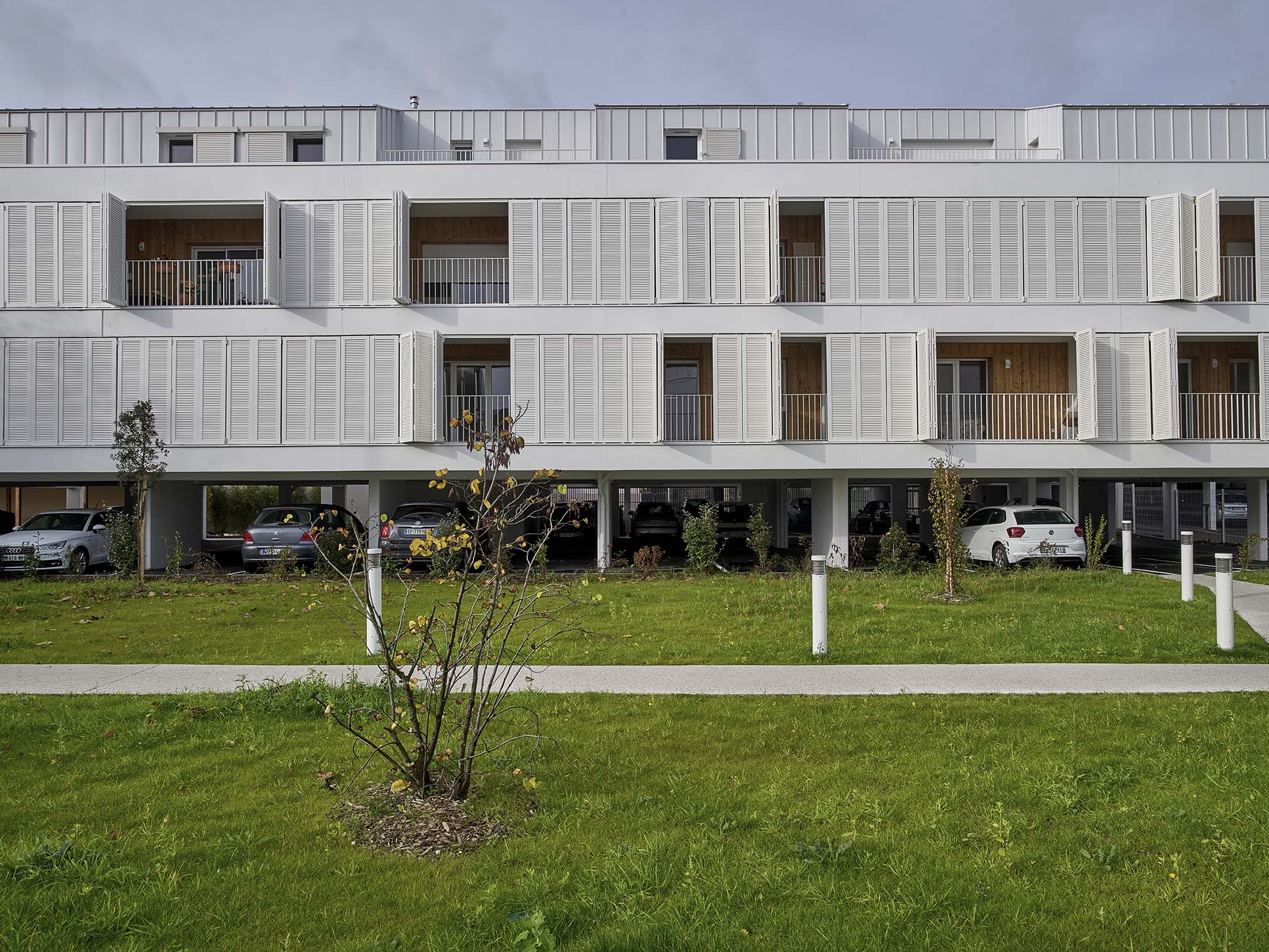 Les enjeux principaux d’Équilibre sont d’intégrer le bâti dans le quartier, en proposant une volumétrie en R+2 + Attique, scinder les volumes de manière à ne pas venir créer un effet de masse sur le Boulevard Brandenburg et favorisant l’implantation de jardins de qualités entre les bâtiments mais aussi sur les limites avec les bâtiments voisins existants. Le projet s’implante en ordre discontinu sous forme de trois bâtiments, dont deux sont reliés ensemble par un système de coursives. Ces trois corps de bâti distincts, à l’alignement du domaine public, génèrent des interstices végétalisés, des percées visuelles sur des espaces verts largement plantés et visibles depuis la rue. Favoriser une bonne exposition des logements avec un grand nombre de traversants, augmente ainsi l’ensoleillement naturel et la qualité d’usage.
